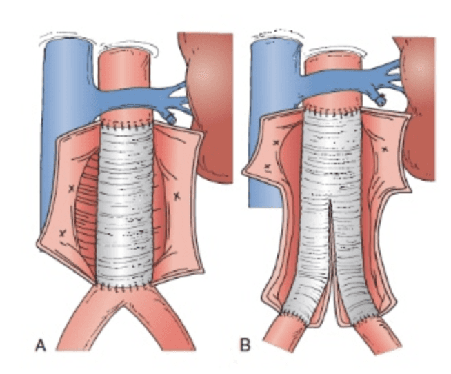 ha sido y sigue siendo en muchos casos la Cirugía Abierta, abriendo el abdomen, llegando al aneurisma y sustituyendo la arteria patológica por una prótesis de material sintético que cosemos en los extremos de las arterias sanas.