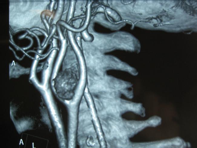 podemos encontrar una masa que separa la bifurcación carotidea y llegar al diagnóstico definitivo mediante ANGIOTAC, ANGIORM O ARTERIOGRAFÍA.